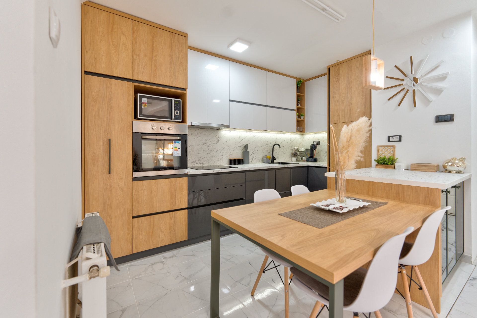 Topli tonovi drveta u kombinaciji sa modernim sivim frontovima stvaraju savršen balans između prirodnog i savremenog.