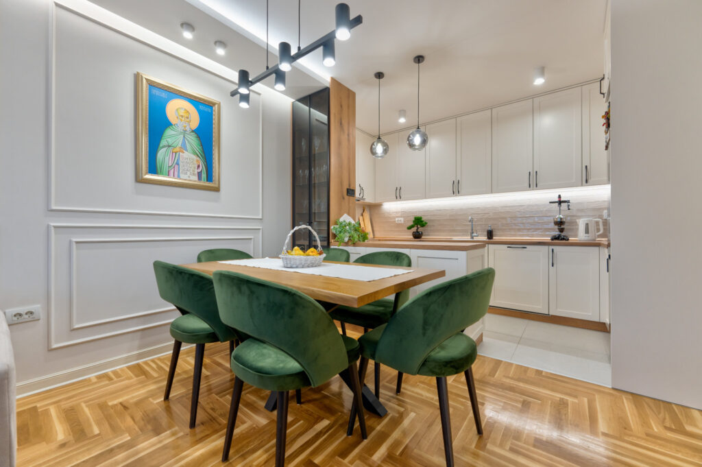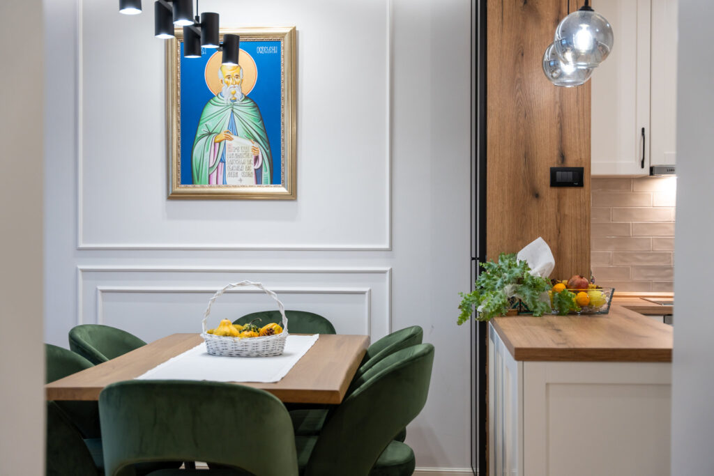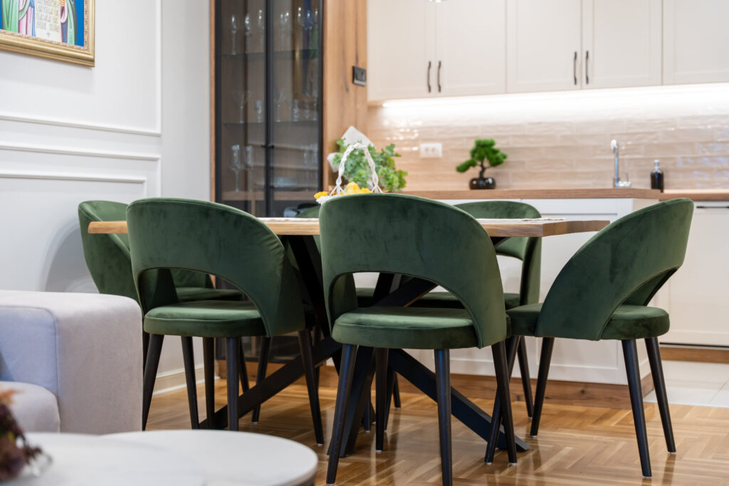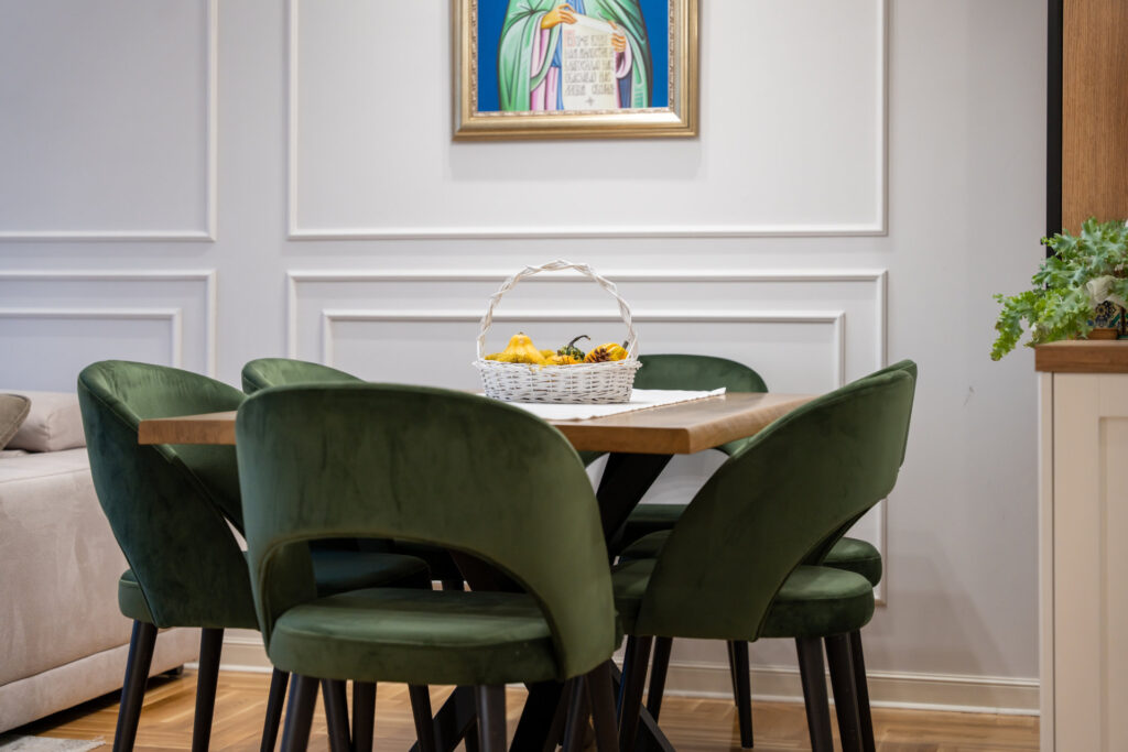 Topli tonovi drveta, baršunaste zelene stolice i detalji u svetlim nijansama stvaraju prijatan i domaći ugođaj.