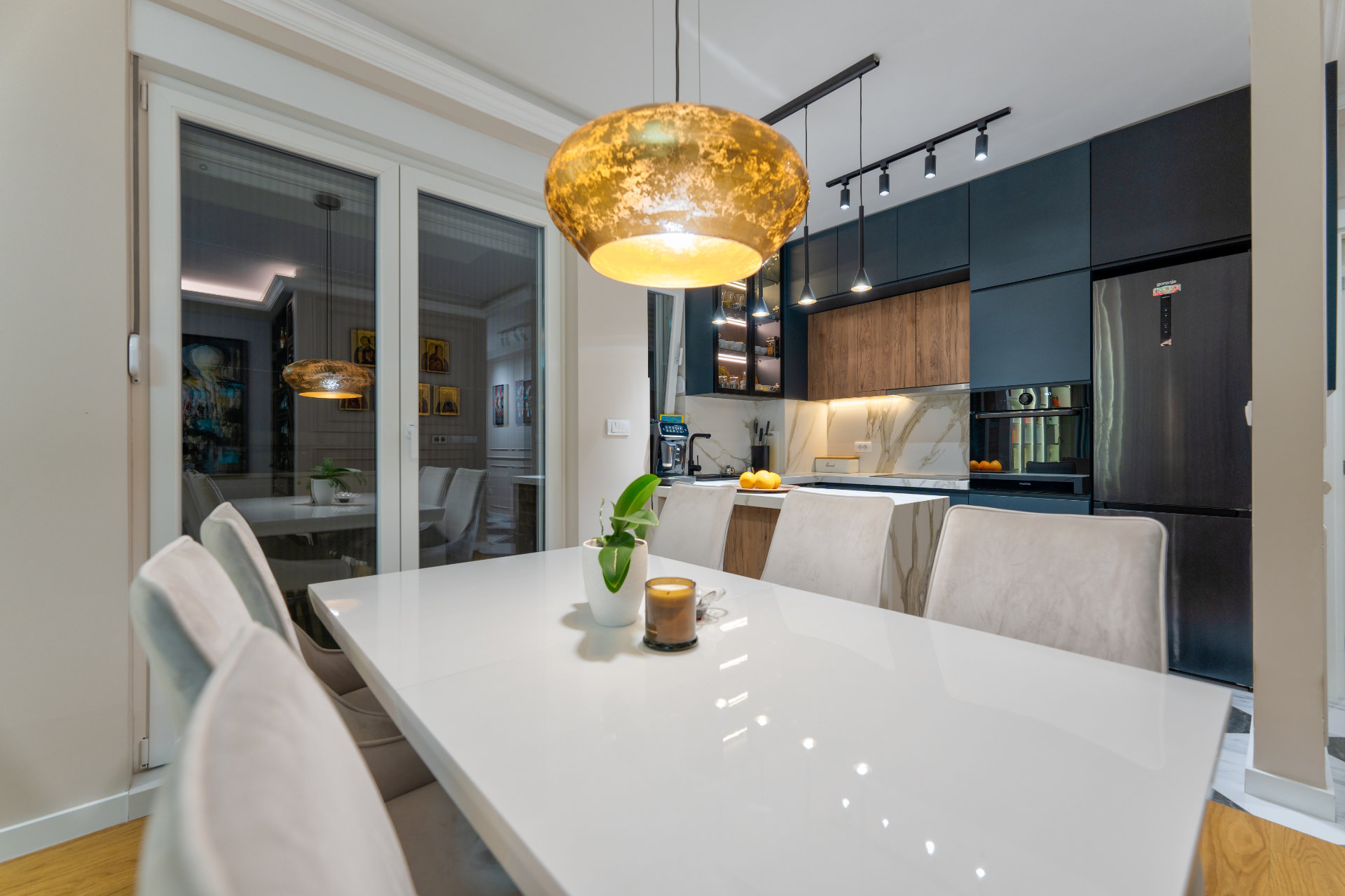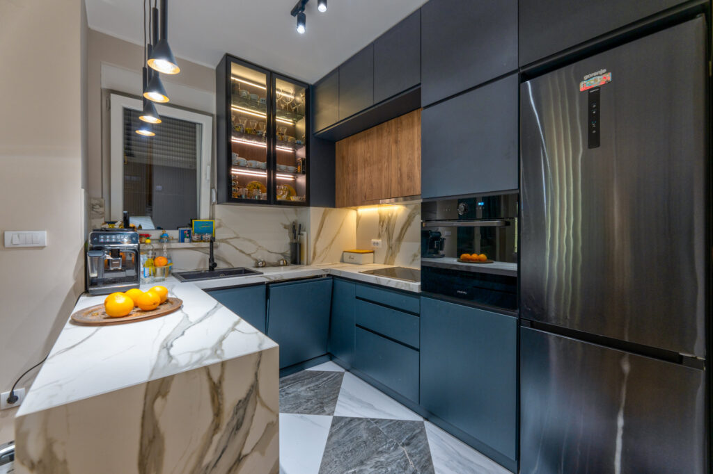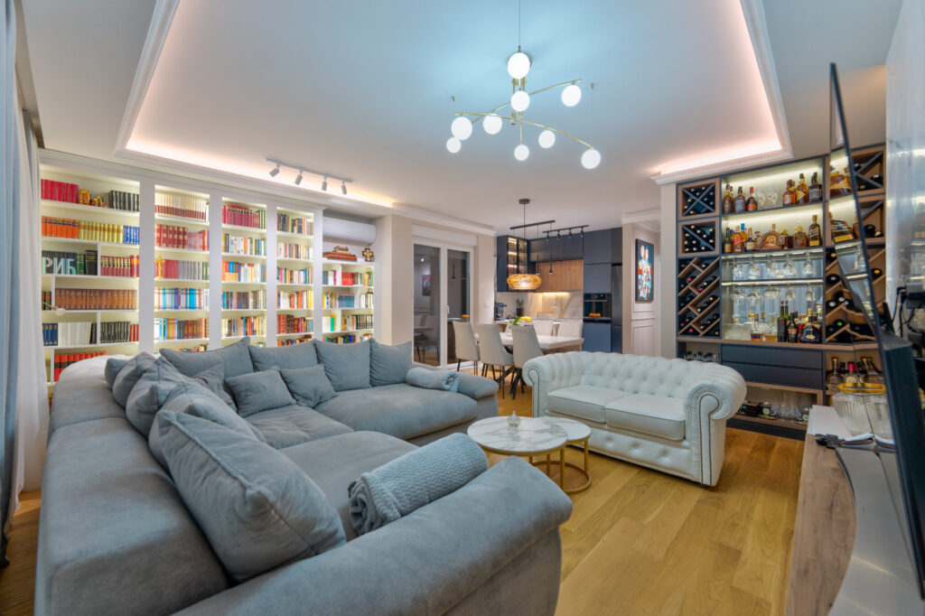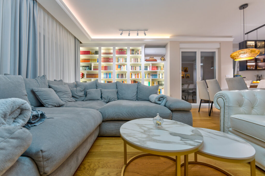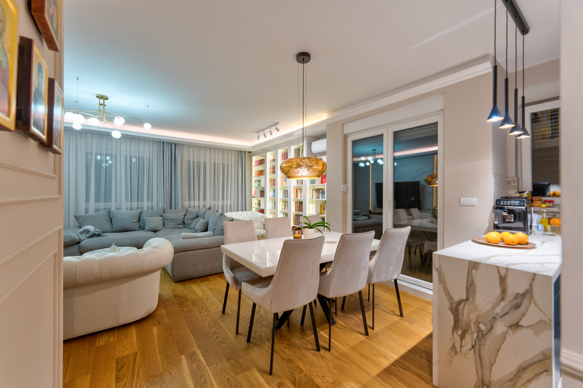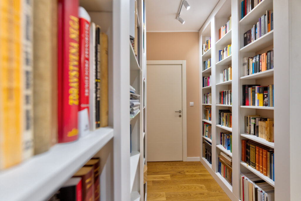 Kuhinja u tamnim nijansama sa mermernim dezenom unosi dozu luksuza, dok biblioteka sa osvetljenim policama postaje srce dnevne zone — spoj estetike i funkcionalnosti.