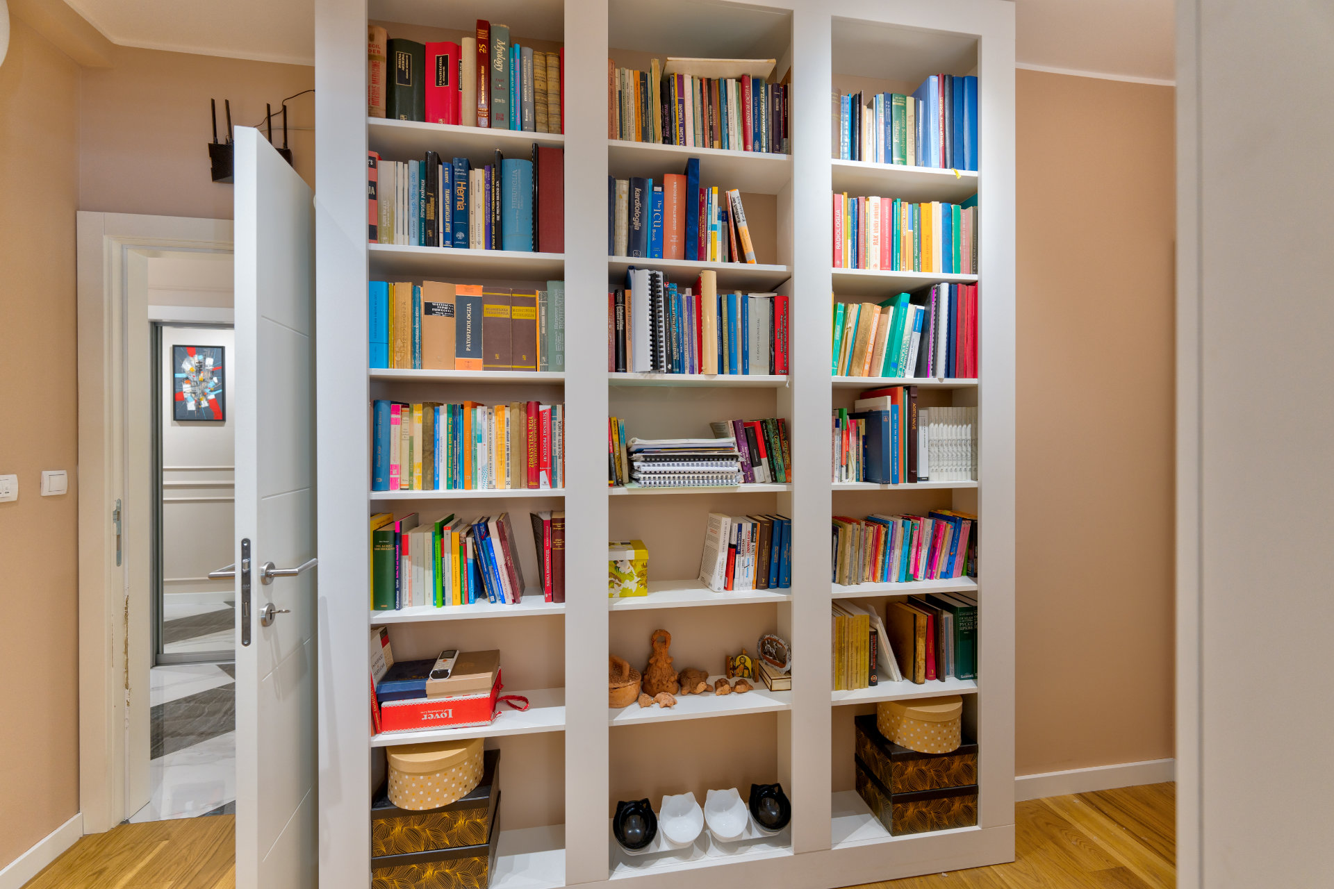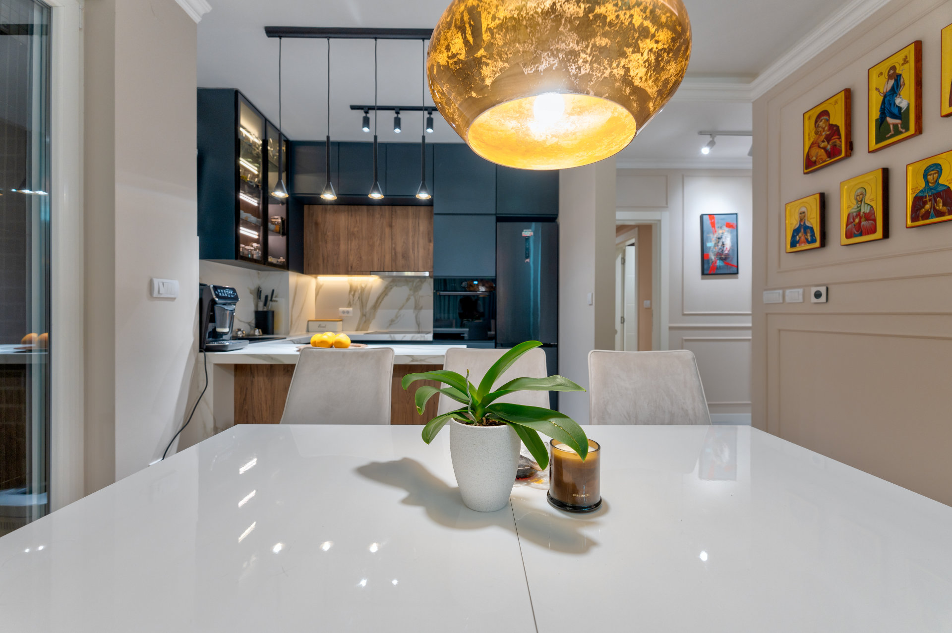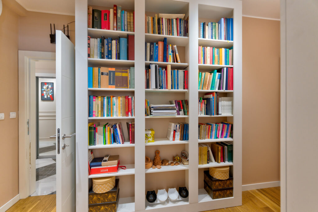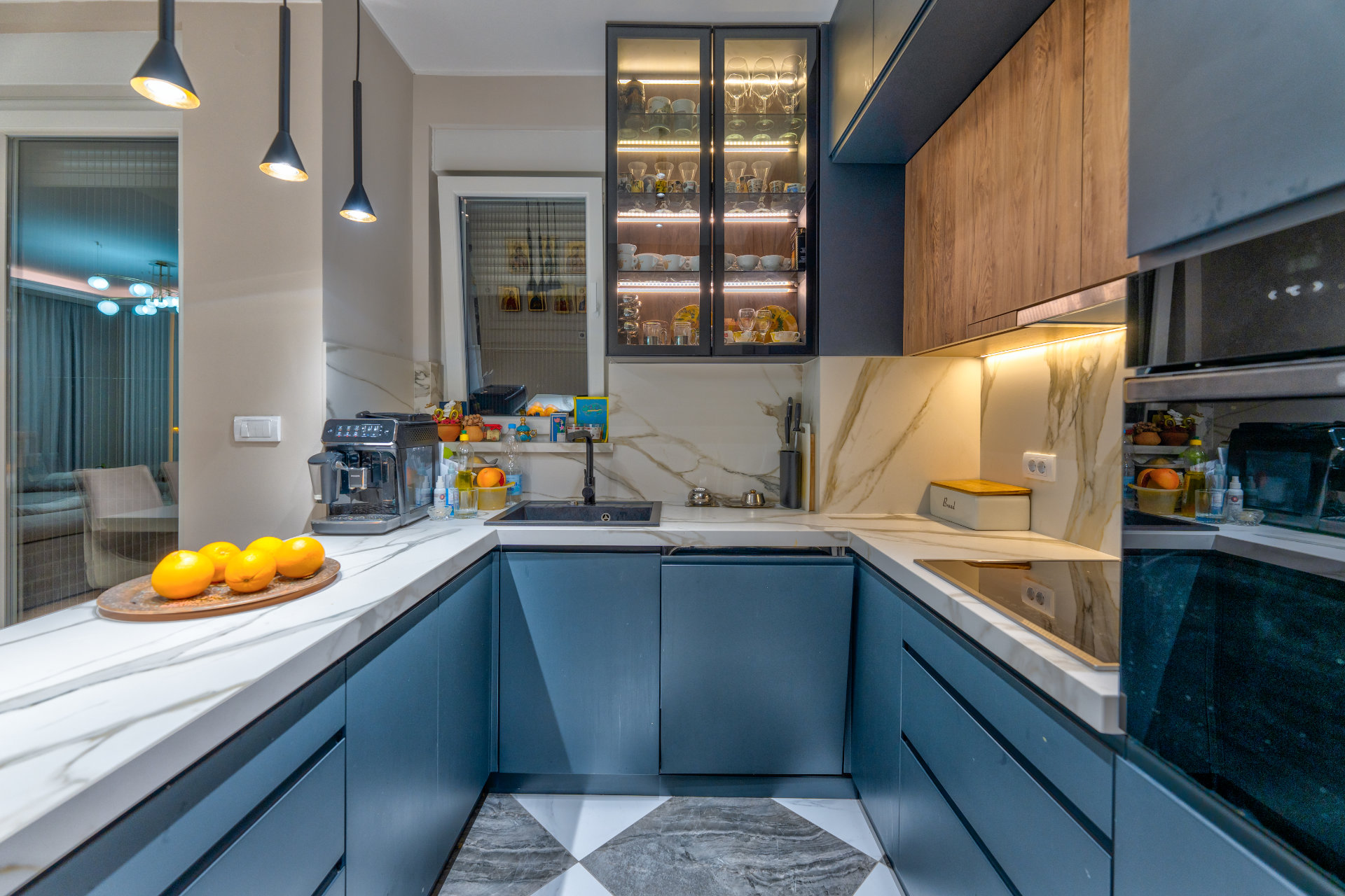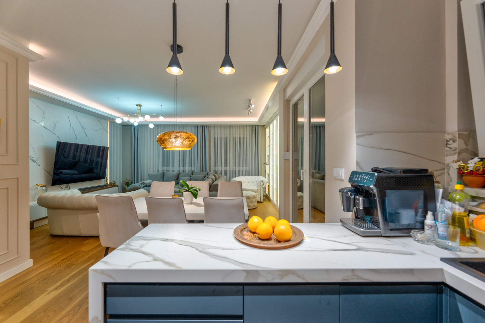 Kuhinja u tamnim nijansama sa mermernim dezenom unosi dozu luksuza, dok biblioteka sa osvetljenim policama postaje srce dnevne zone — spoj estetike i funkcionalnosti.
