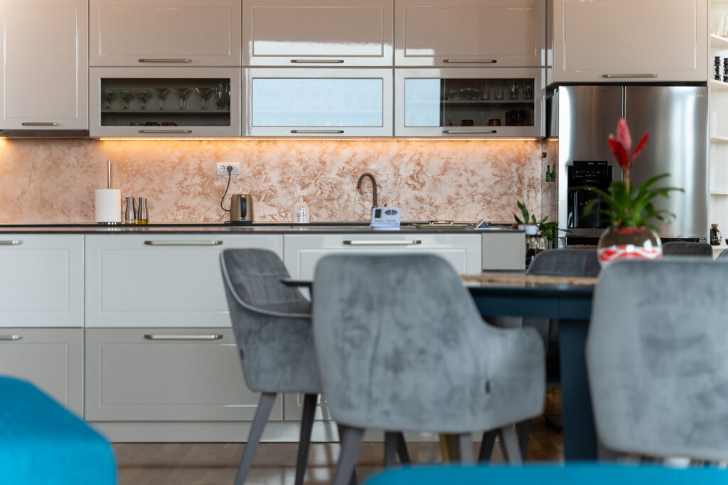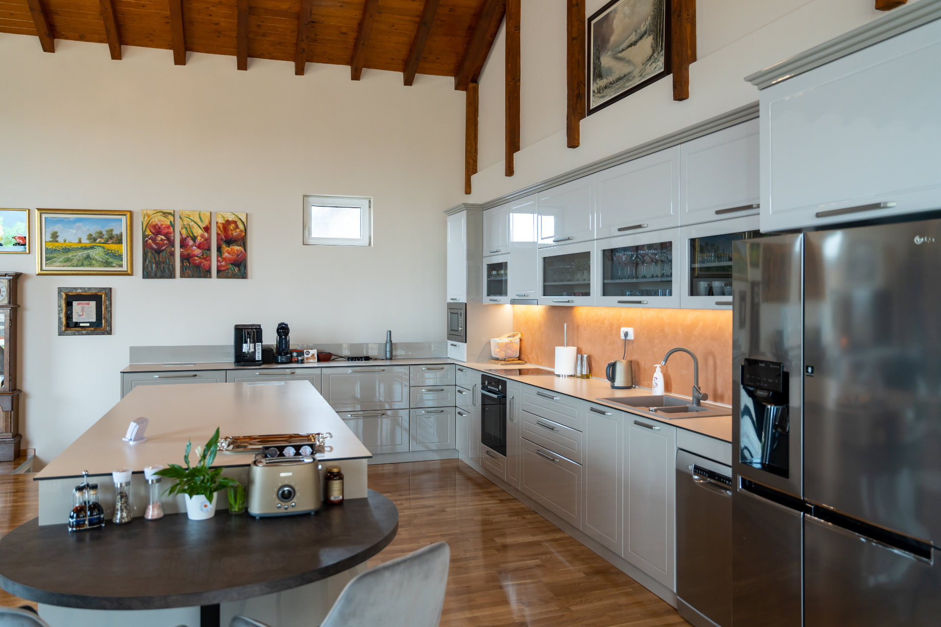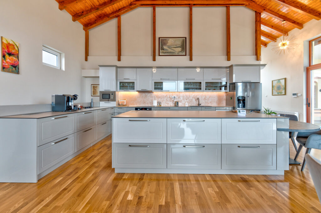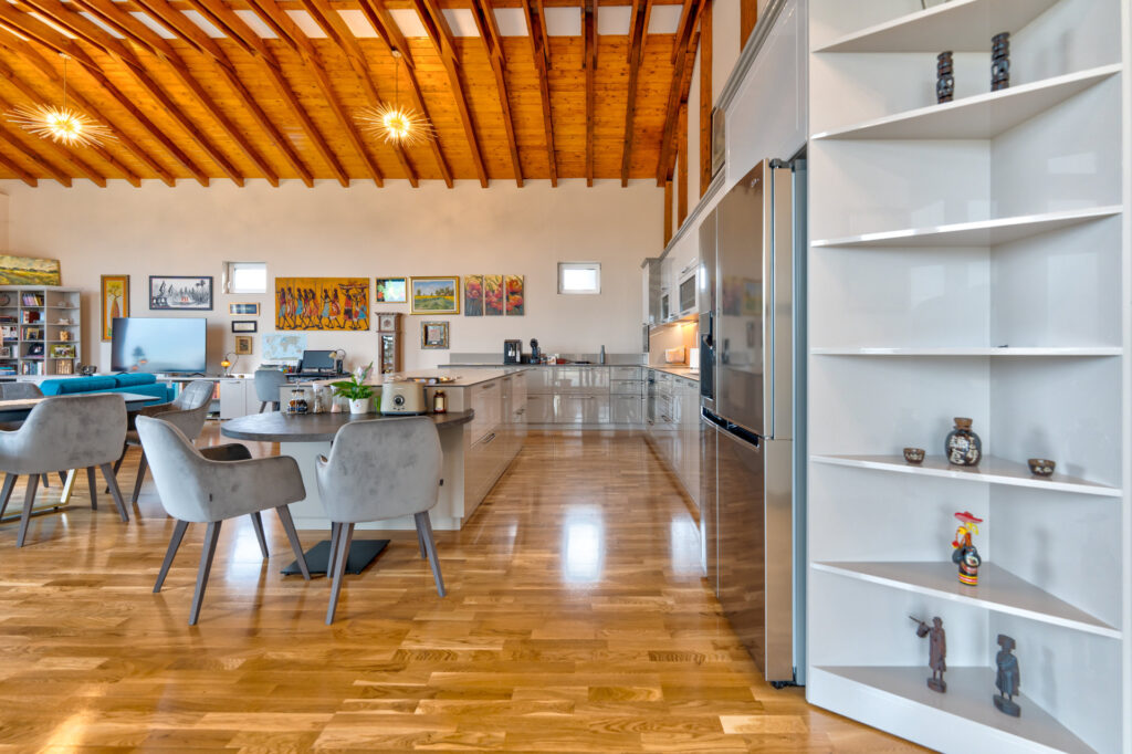 Visoki plafoni i prirodna svetlost otvaraju enterijer, dok kuhinja u sivoj nijansi sa diskretnim detaljima pruža osećaj luksuza i smirenosti.