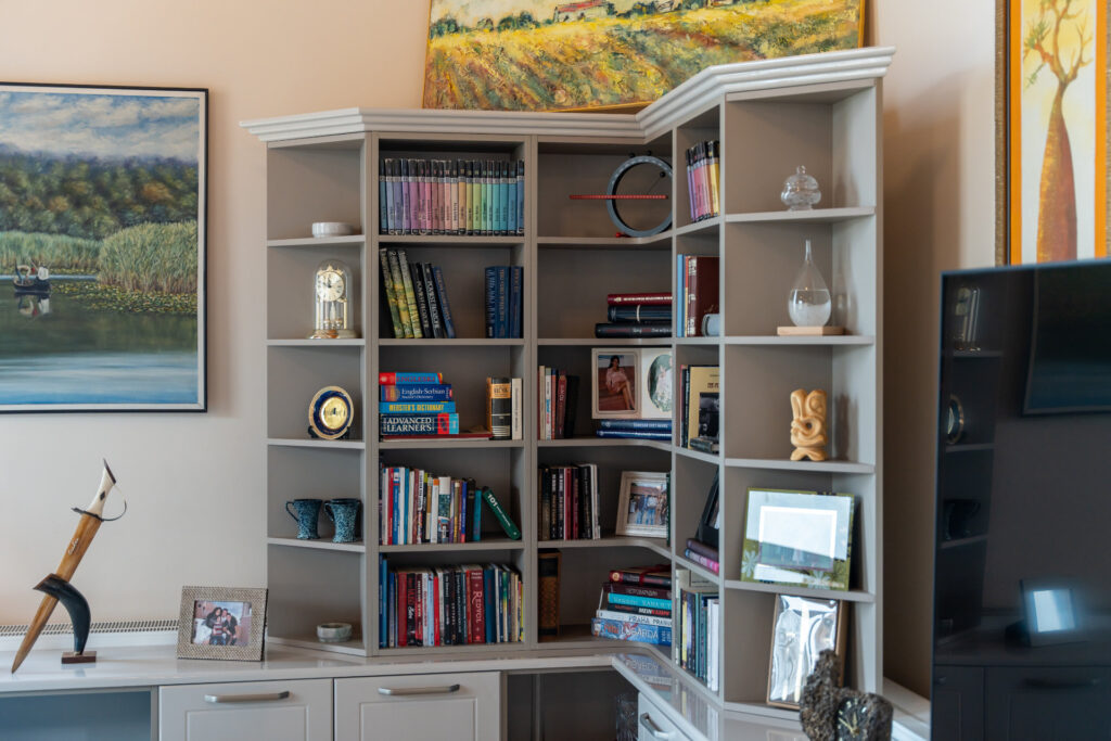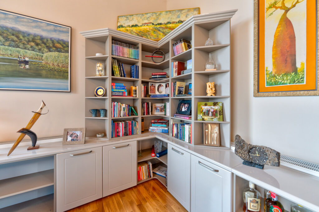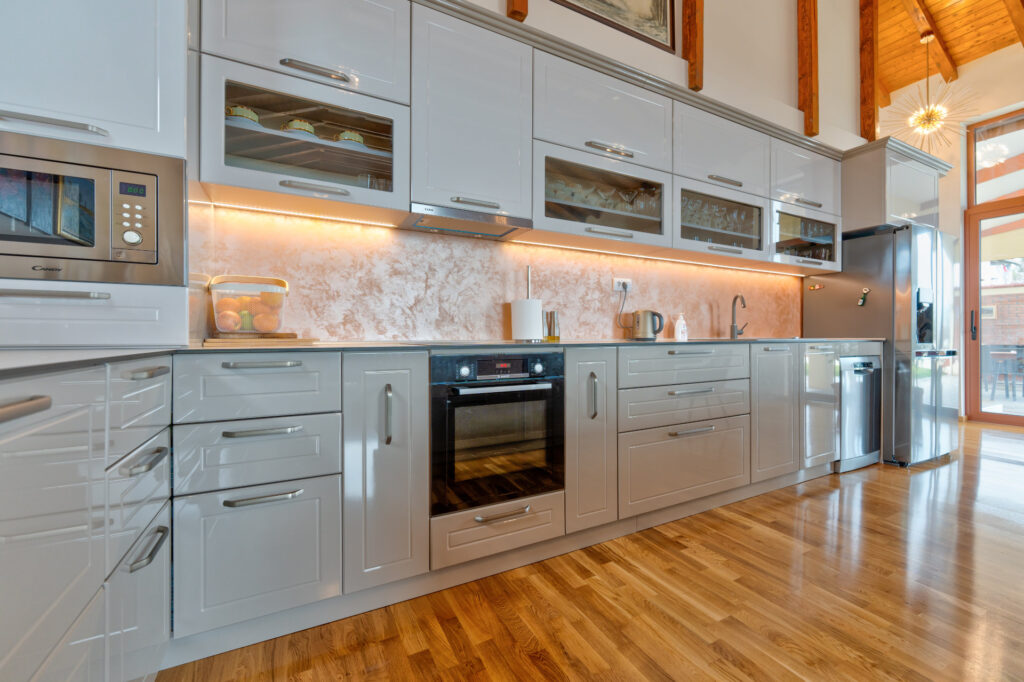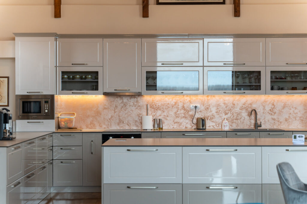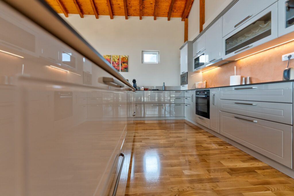 Visoki plafoni i prirodna svetlost otvaraju enterijer, dok kuhinja u sivoj nijansi sa diskretnim detaljima pruža osećaj luksuza i smirenosti.